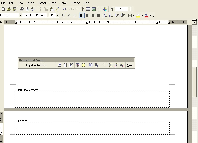 (kết quả thu được: các thuộc tính áp dụng cho Section 2 cũng áp dụng cho Section 3). Trang đầu (bìa): toàn bộ đầu trang và chân trang để trống Định dạng đầu trang: vào trình đơn View. Header and Footer, bản văn sẽ được tô mờ, các khung soạn thảo đầu trang và chân trang xuất hiện với các chú thích vị trí trong từng trang, đồng thời có một thanh công cụ định dạng đầu và chân trang. Sau đó: